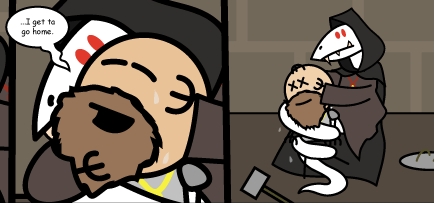 Being put in prison and awaiting to meet Shojo, the others escape their jail cells. However, Miko reaches the cells before they go out the door, and Haley rushes them back into the cells. The door swings open, and Miko questions Durkon if they were trying to escape. Durkon, loopholing through not lying, says that the five of them never left their cells and that lockpicking the doors was a mechanical defect.