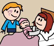 Penelope is in a bed holding a newborn infant with Orrin smiling at her side.