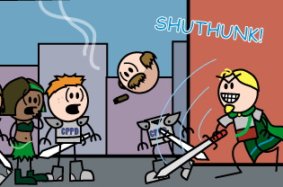 Cop with Black Skin: Yeah, he was all, "Thwack!" and the gnome was all, "Gah!"