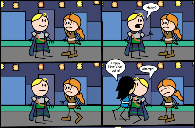 Haley's self-loathing then manifested, appearing as her fifteen-year-old goth self. She suggested that rather than telling Elan, the best way to communicate her feelings to him was simply to kiss him, thus getting the message across without having to get around her language difficulties. The plan was put forward that she should kiss him at midnight, so that, if Elan reacted badly, she could simply dismiss the kiss as a New Year tradition. The moment arrived, but, even though Elan appeared to be waiting for her, Haley's courage failed her and before she made the move, an Azure City resident kissed him instead, leaving Haley to walk away sadly