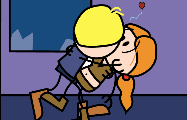 Haley has shown signs of affection for Elan even during the early parts of the comic, like Dungeon Crawlin' Fools, however Elan has never noticed the signs. Her affection seems to not have started at the extremely early parts of the comics, as seen when Haley doesn't pick Elan to be on her split side of the team. However, the most noticeable sign in the first book is when Haley stopped Elan from touching the Gate by dropping on him, in which they stared at each other awkwardly and had a short, awkward conversation afterwards.[19] Other blatantly obvious signs, such as when Elan, telling Haley that he believes in her, causes her to be able to lockpick her prison cell,[20] and Haley dragging Elan for dinner.[21] Her love is truly confirmed when Haley trys to get up the nerve of saying "Elan, I'm in love with you.", but ultimately fails due to her speech condition. Haley, at the time of New Year, ultimately fails to kiss Elan and another girl kisses him.