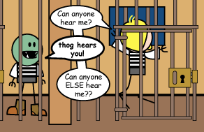 Warden: Now that you've been healed and dressed in your new prison togs, you'll be in that cell there until your trial—and then, gods willing, for the rest of your very short lives.