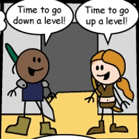 | Up/Down a Level | The OOTS (most commonly Roy and Haley) often get confused about going up a level, as in going up a "level" of stairs, and going up a level, as in getting raised a level in their character class. | Roy mentions not starting up the gag again when Haley asks him when to go up a level or go down a level in 841. | 12, 124, 841, 1188 | |