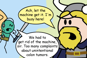 Belkar turns Yokyok's skull into a tortilla chip bowl in #358, as well as using his tail and other parts to make extra chunky salsa (though he later states that had no intention of actually eating the salsa). Belkar follows through on his planned use of the Oracle's head by turning the still-living head of Yukyuk into Mr. Scruffy's litterbox in #835. |