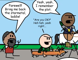 Flashback to Nale and Thog coming around the corner of the Barbarian's Guild just as Belkar is walking in. Thog carries a sleeping bag and a teddy bear, and wears a nightcap.