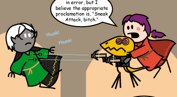 Vaarsuvius: I may be in error, but I believe the appropriate proclamation is, "Sneak Attack, bitch."