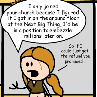 Haley: I only joined your church because I figured if I got on the ground floor of the Next Big Thing, I'd be in a position to embezzle millions later on.