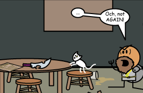 Mr. Scruffy scratches at Durkon's door, "scratch! scratch!"