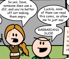 - Belkar says that Barbarians can't read the comic because Barbarians start the game not knowing how to read.